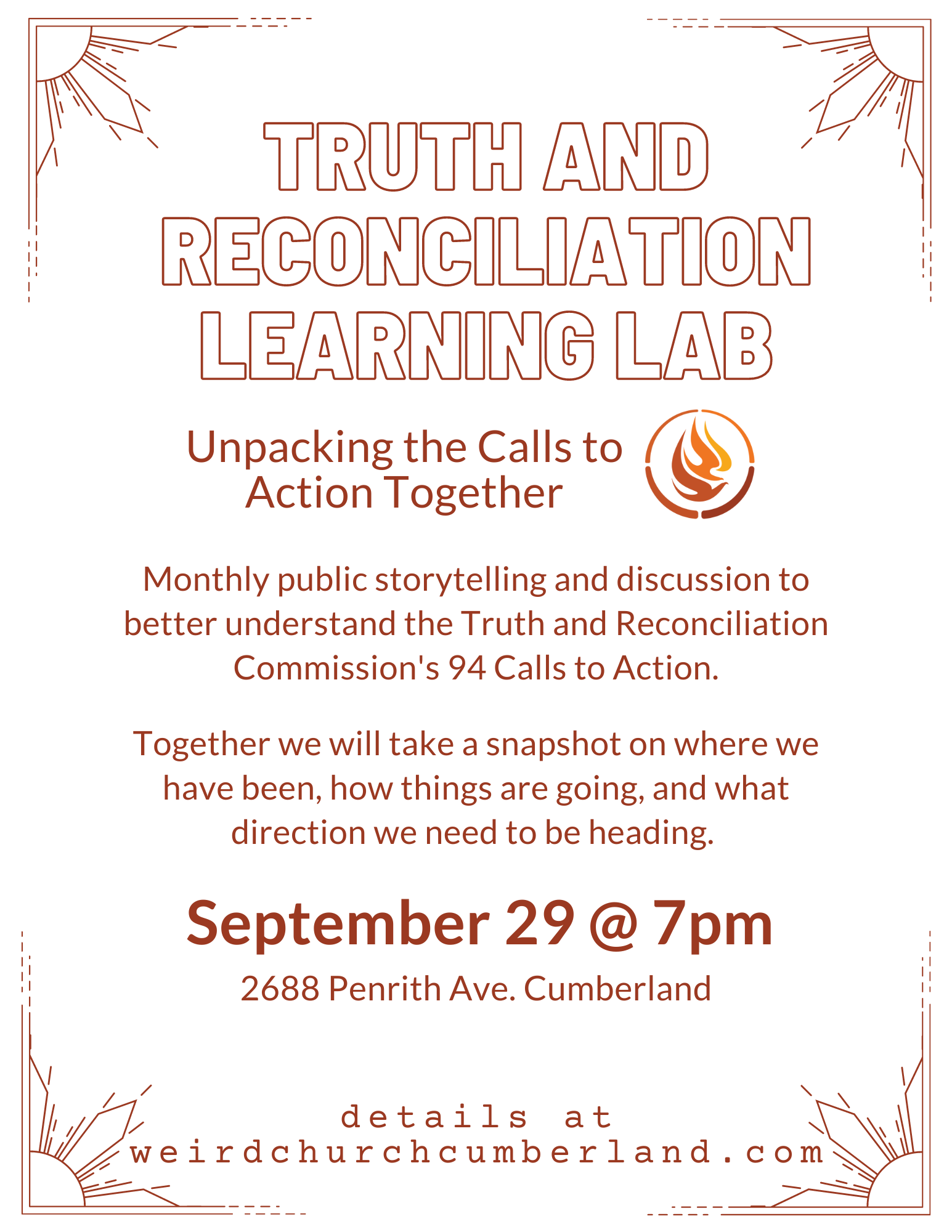 Each month the Weird Church Truth & Reconciliation Team will be hosting a community wide conversation on the Truth and Reconciliation Commission 94 Calls to Action where experts in their subject will be coming to educate, communicate, and host discussion.