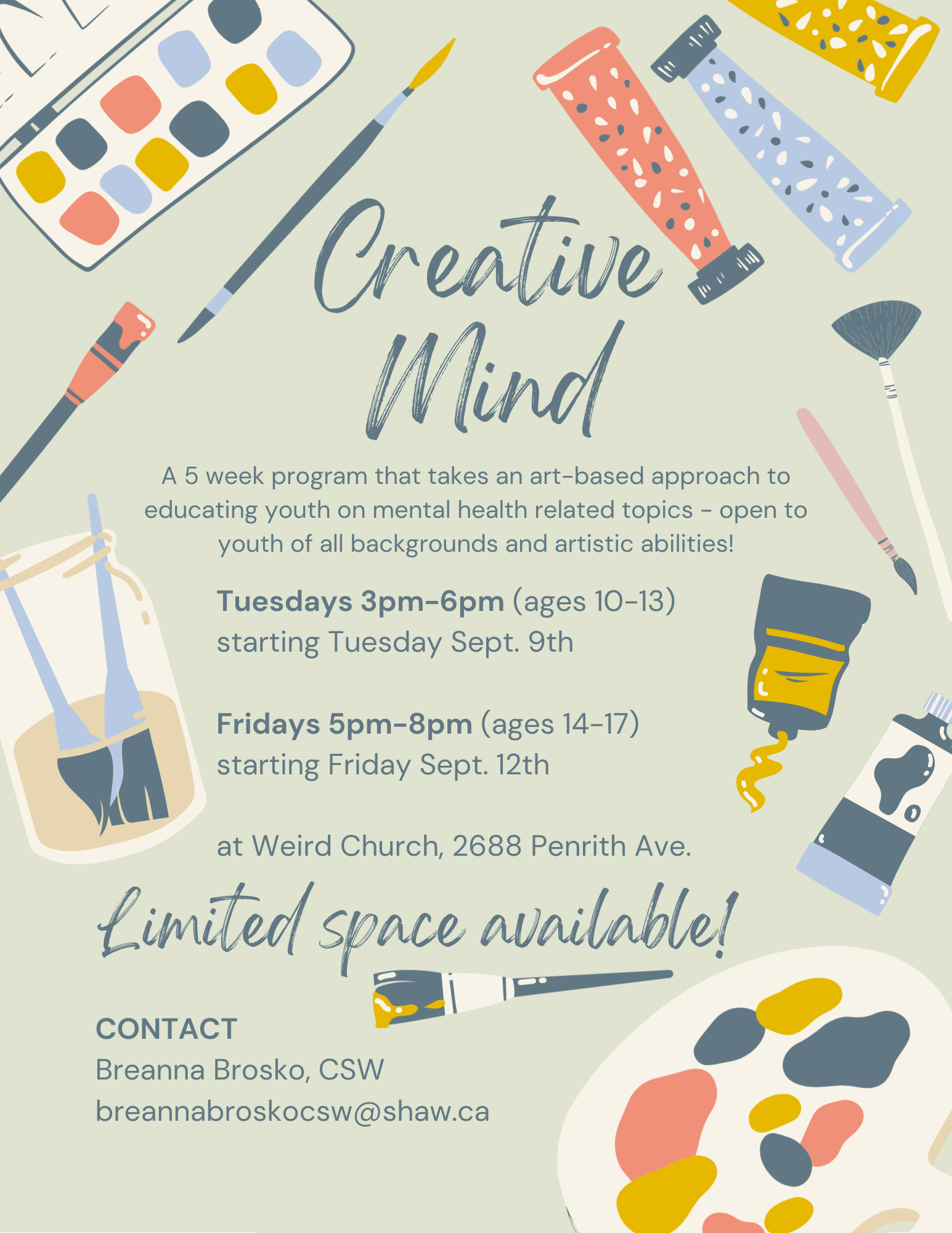 Creative Mind is a 5 week program that takes an art-based approach to teaching youth about different mental health related topics and provide connections to resources in our community, and is open to youth from all backgrounds and abilities!