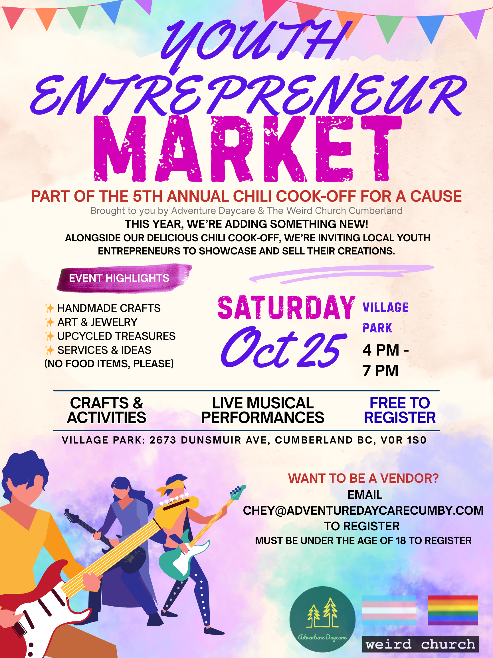 Weird Church and Adventure Daycare are at it again, for the 5th Annual Chili Fest! Join us to taste the best chili Cumberland has to offer and decide who will be crowned 2025 Chili Champion. Music, crafts, games, magician, a bouncy castle and more make for a fun filled party for all ages.